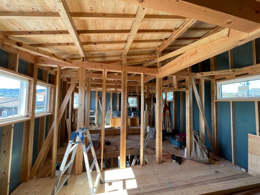 大工工事は順調です 一階は大工の梅さん 床貼りを頑張っていますよ