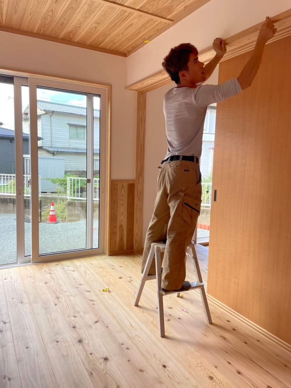 ショウマ大工、3枚引き戸のドア枠を磨いております。