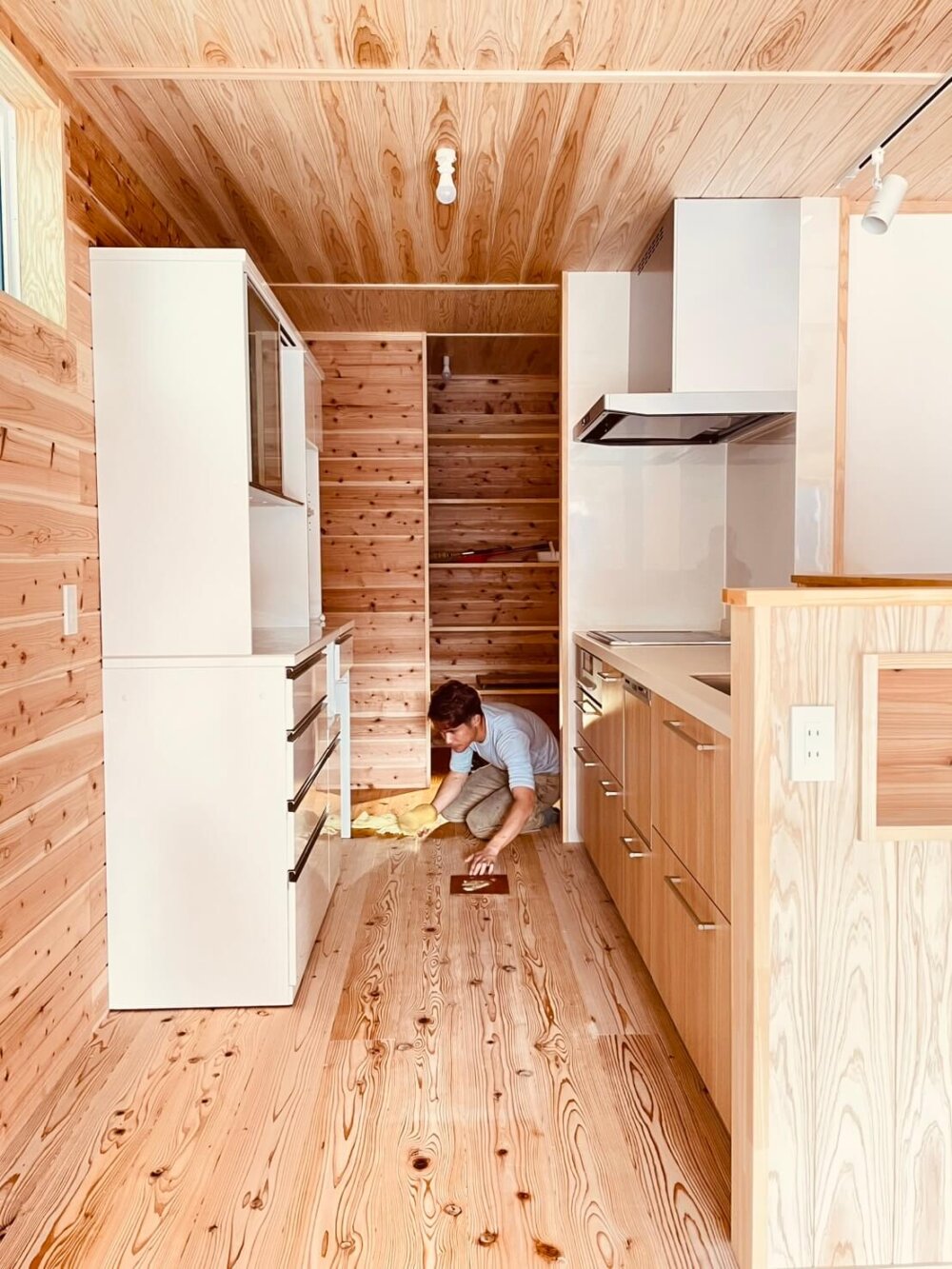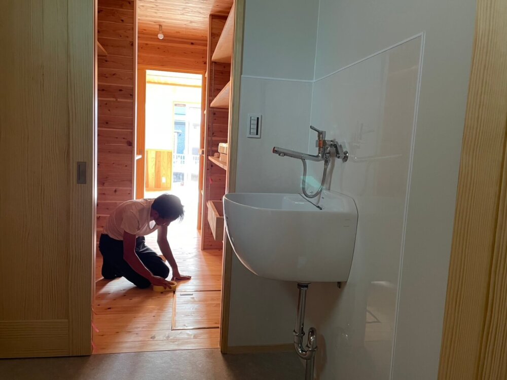 ショウマ大工はキッチン周りをゆっくりしっかり蜜蝋ワックスをかけています。