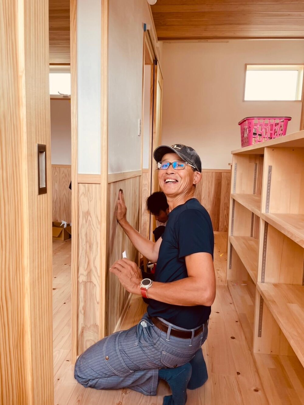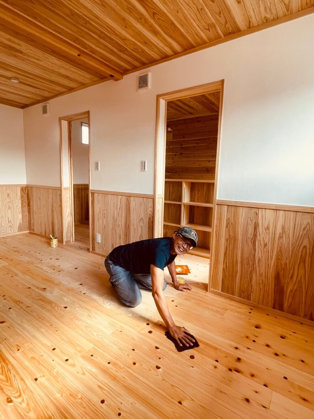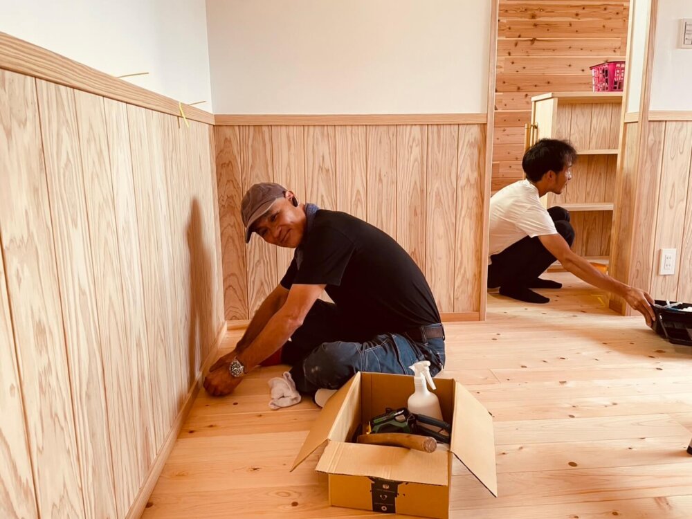 柴田常務・テツ大工も板を拭きあげたり、磨き上げています。