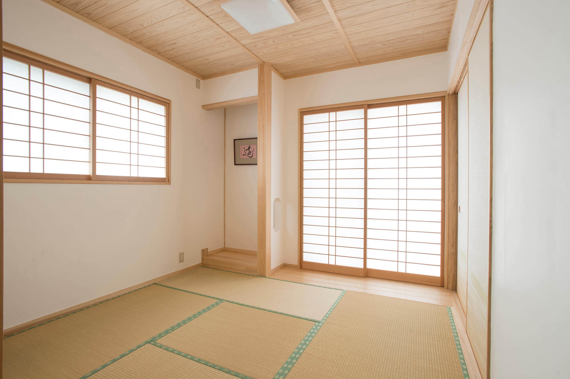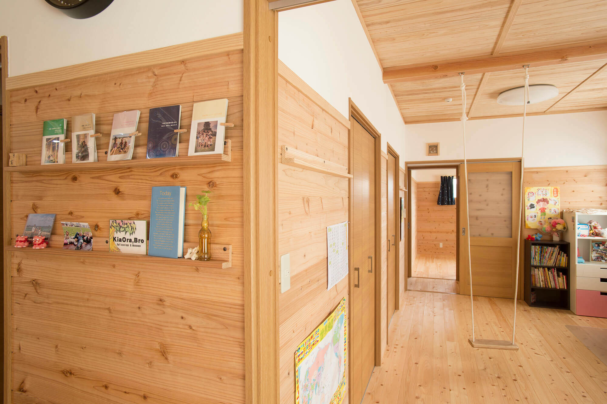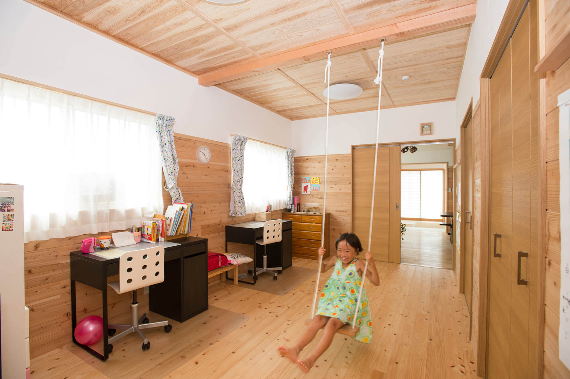 明るい家族が集まるリビングの先には、ご主人がD.I.Yしたウッドデッキ。遊び盛りの子ども達は今日はどんなことをして遊ぶのかな。廊下や子ども部屋から自由に出入りが出来る間取りは、家族のコミュニケーションも深めてくれます。裸足になって歩く、無垢の床は心地よい肌触り。健康、笑顔で花丸元気!!