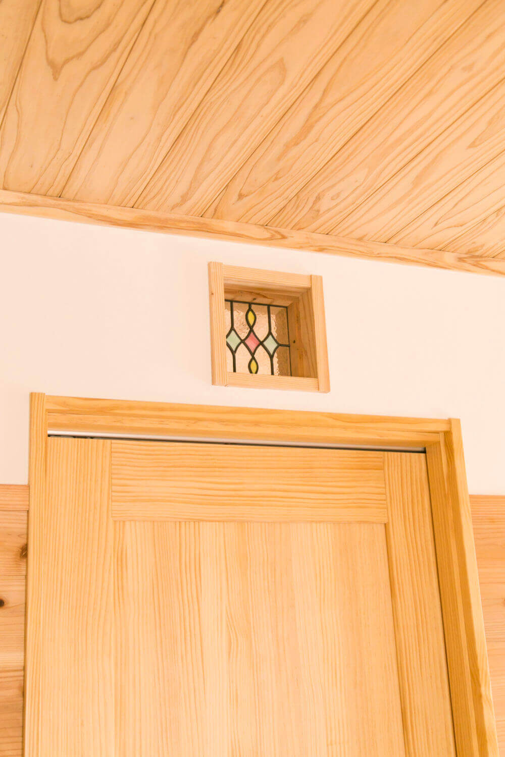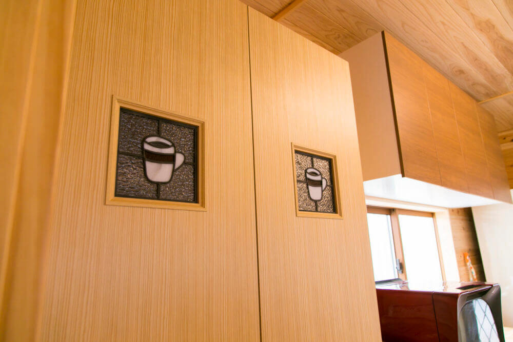造作のカップボードにはコーヒーカップ柄のステンドグラスをはめ込んだこだわり仕様
