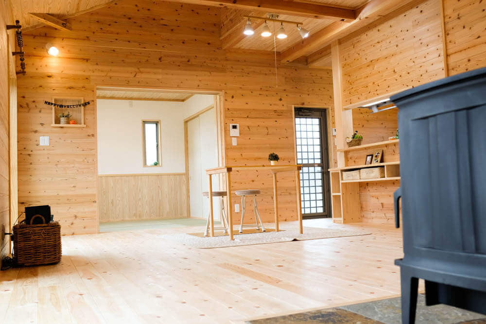薪ストーブの熱が家じゅうがぽかぽか暖かく、今年の冬の寒さの中でもとても快適に過ごせる平屋の木の家。