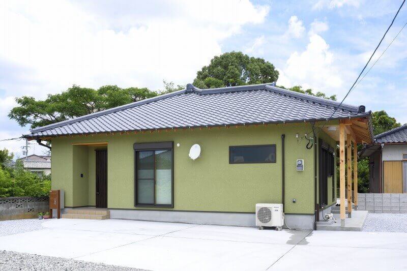 和風住宅の外観 緑色の外壁が風景に馴染む純和風の平屋づくりの木の家