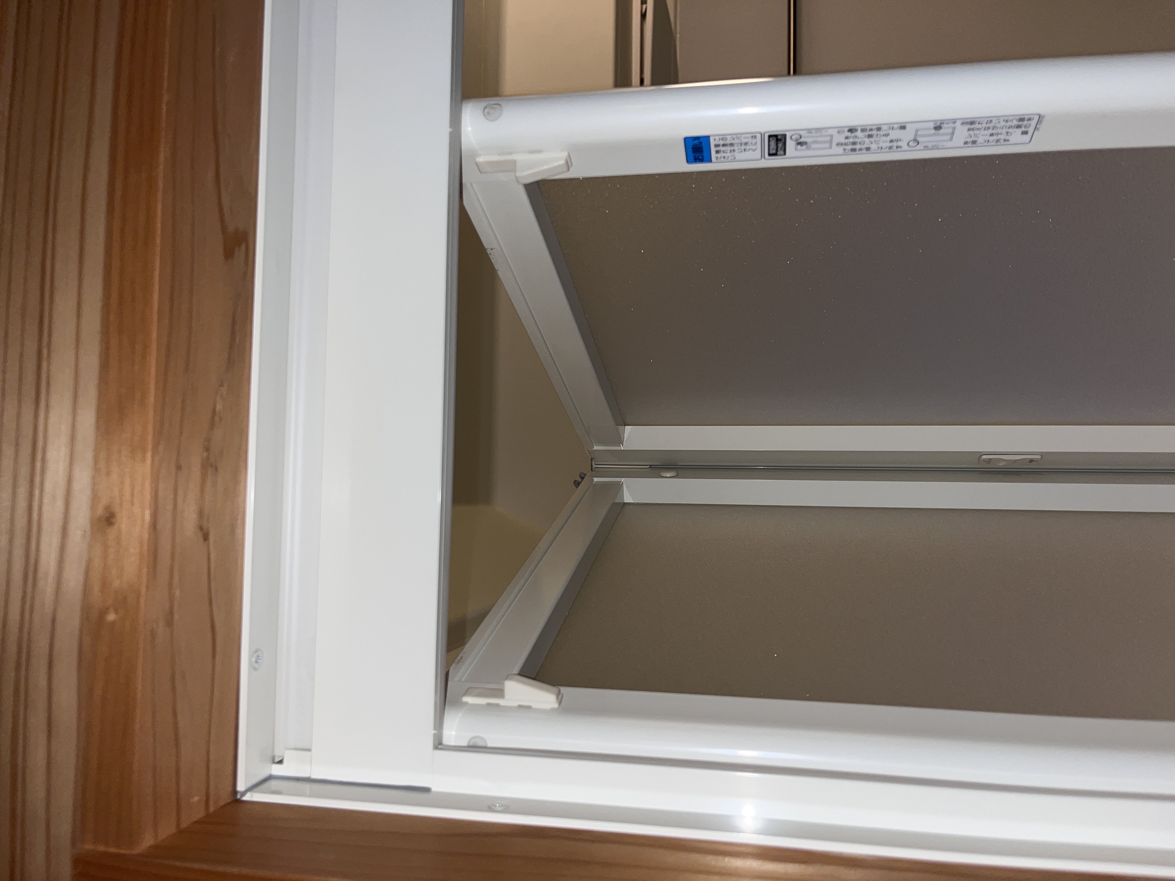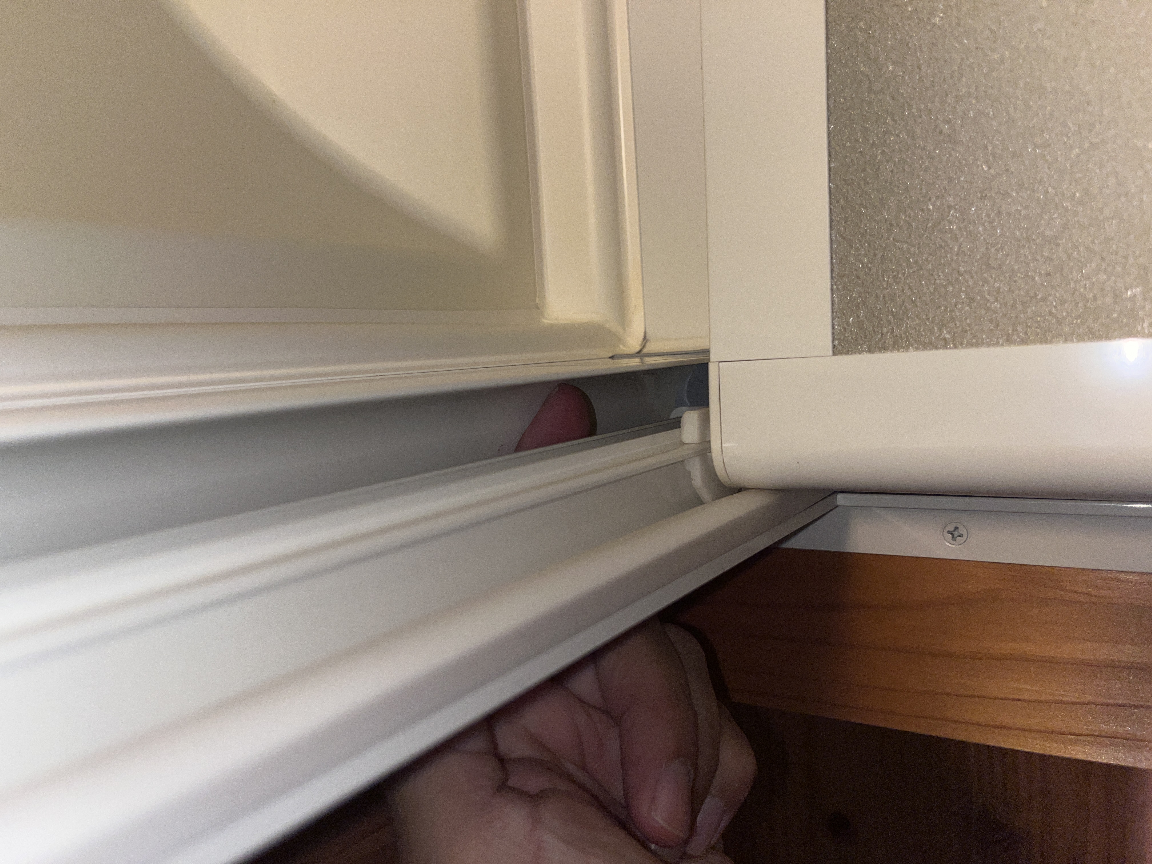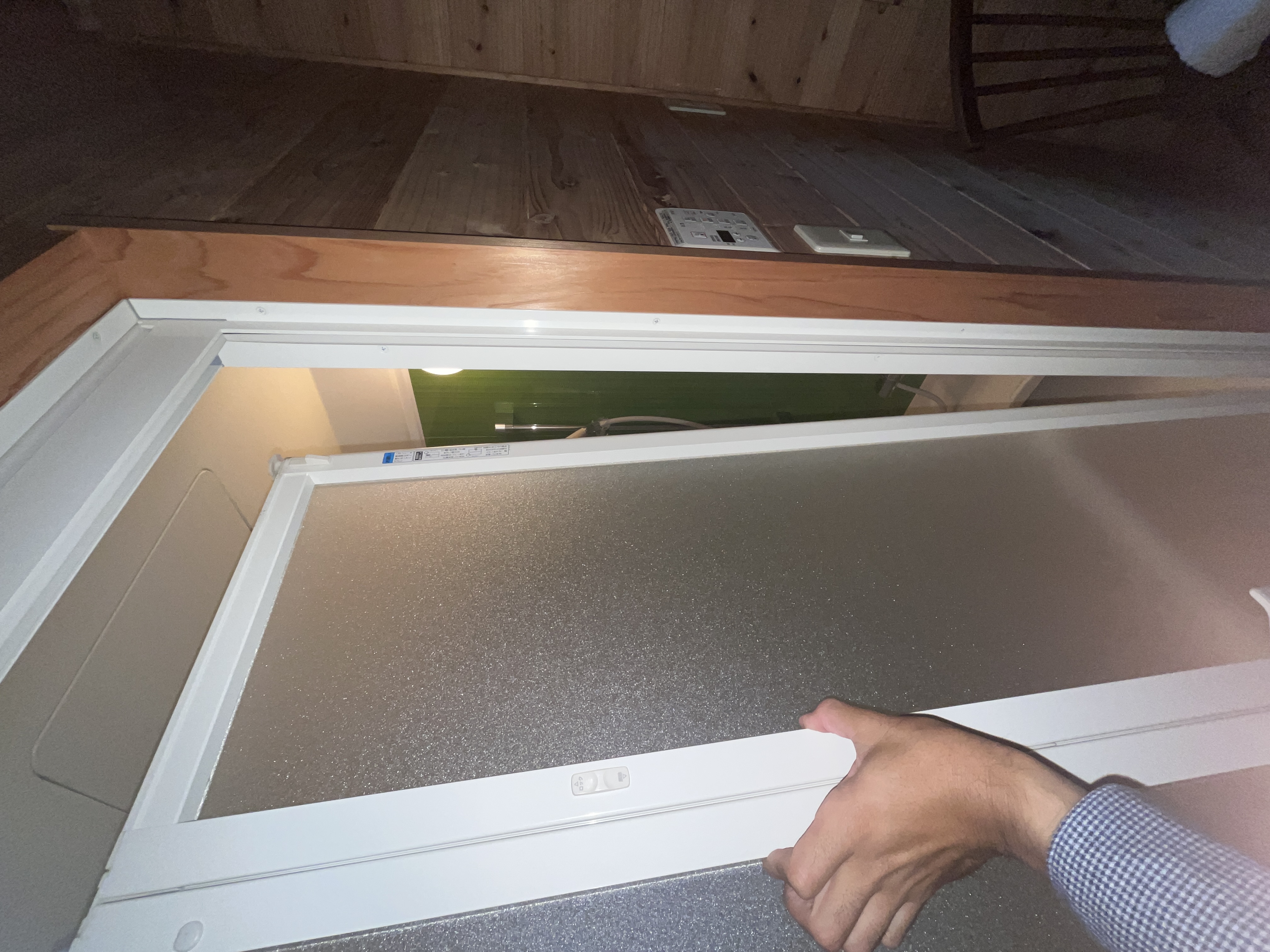 上部のレールの爪が下がり、扉が傾きました。このままお風呂側に倒れますのでうまくつかんで下のレールからも外してください。