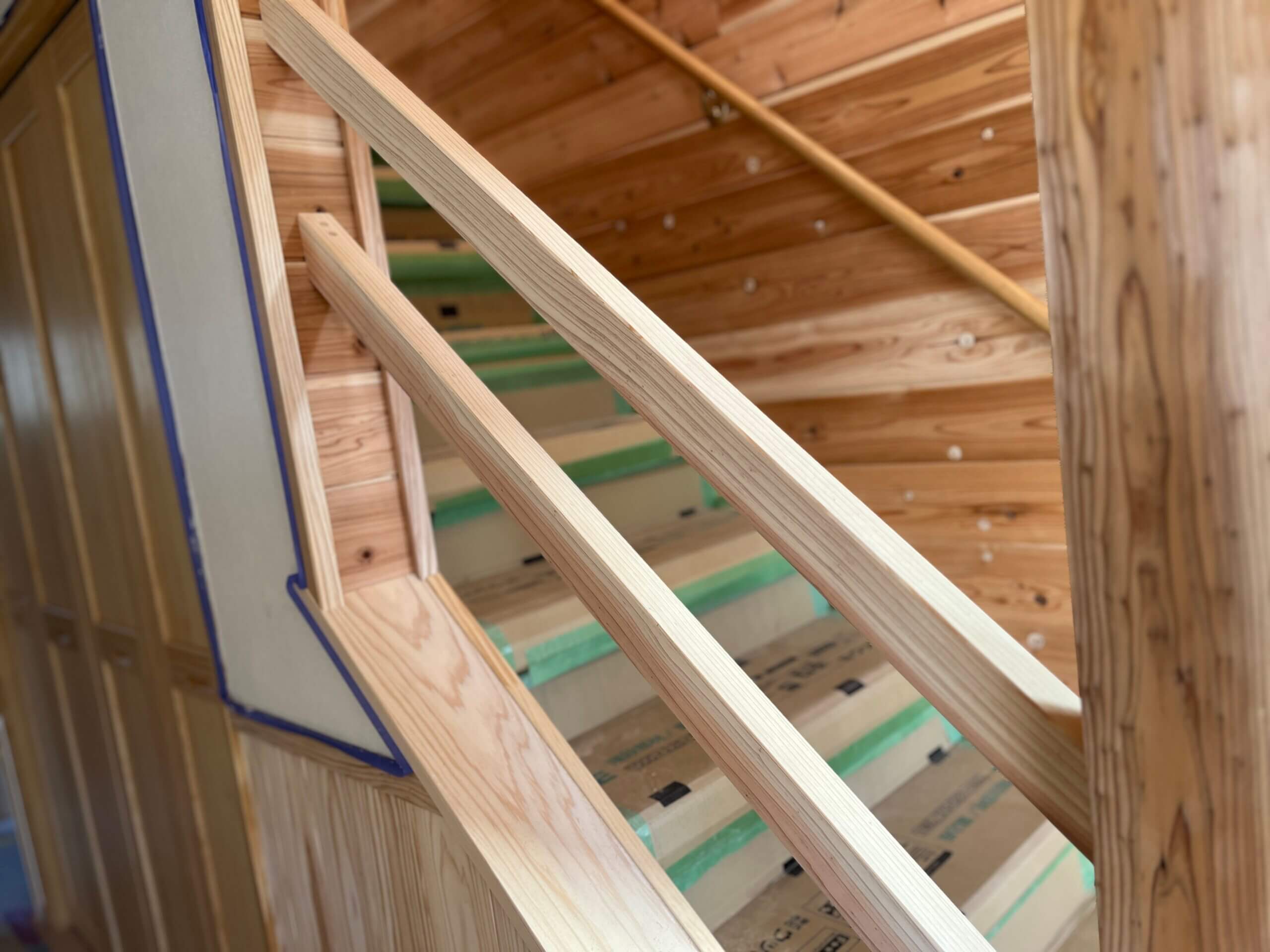 階段の手すりや柵も木を加工してとりつけています。