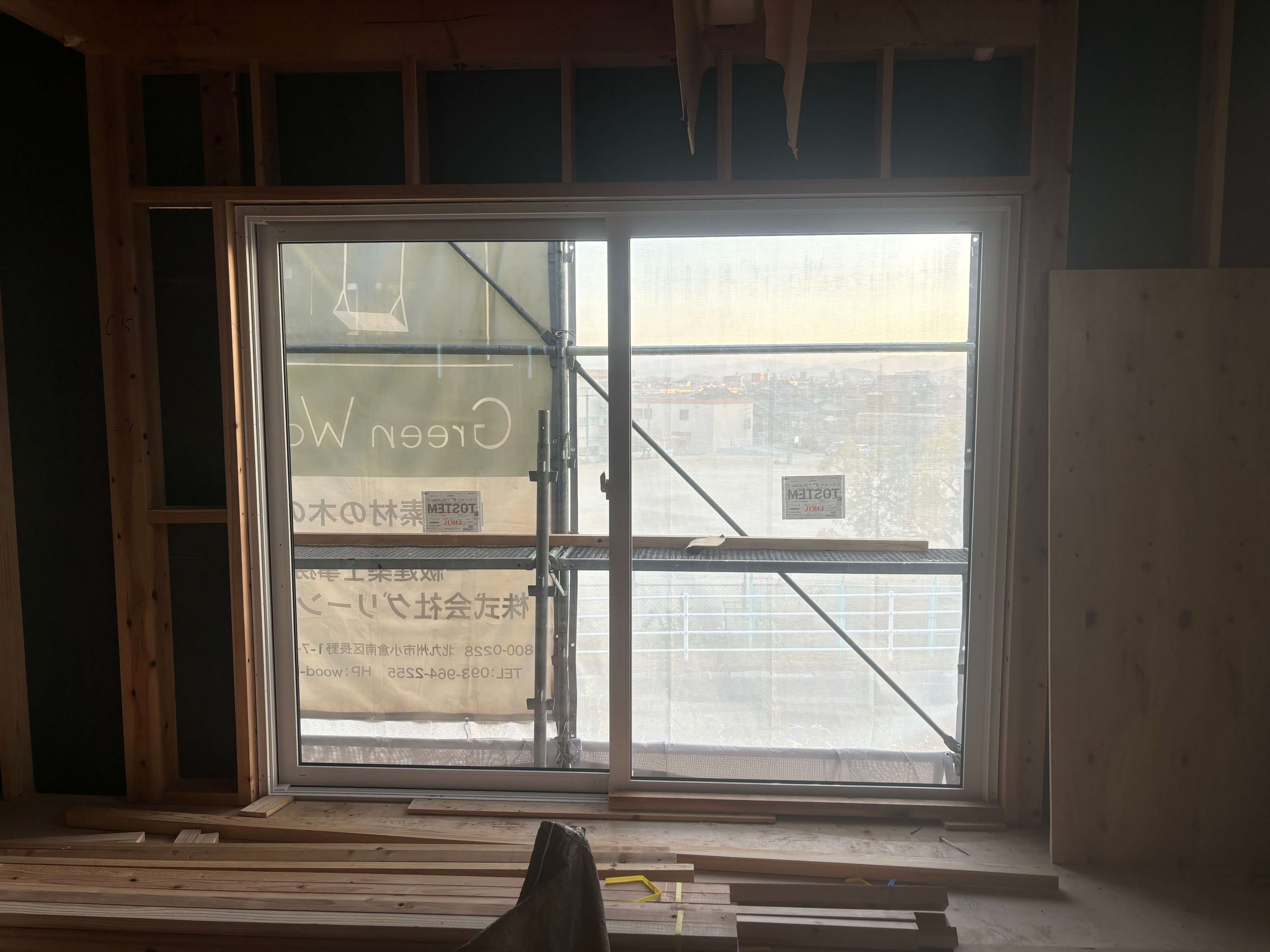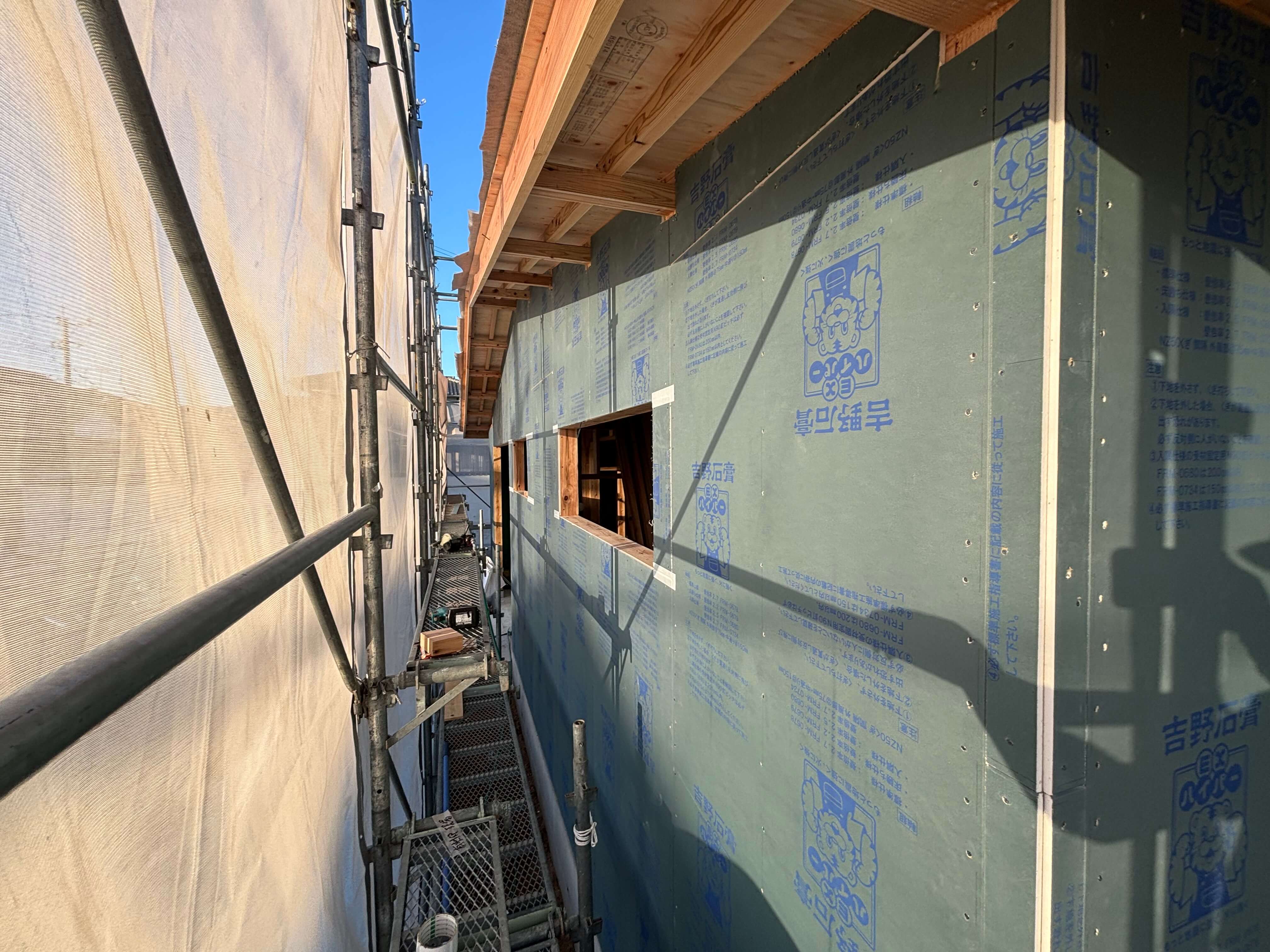 火曜日に棟上げが終わりまして、外部工事を中心に進めていってます。