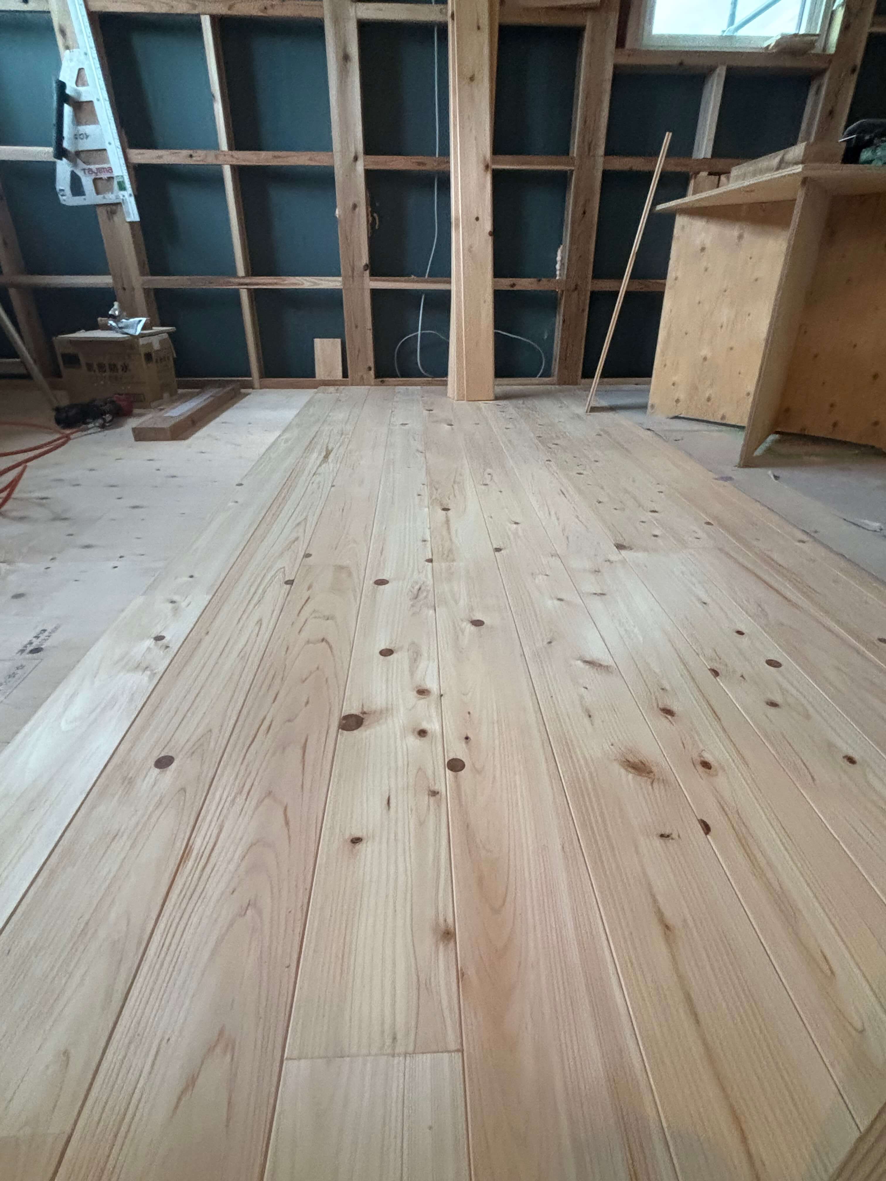 そして、内装の方は床張りを行なっていってます。ここのお家は1階は杉のフローリング、2回は桧のフローリングとなっております。