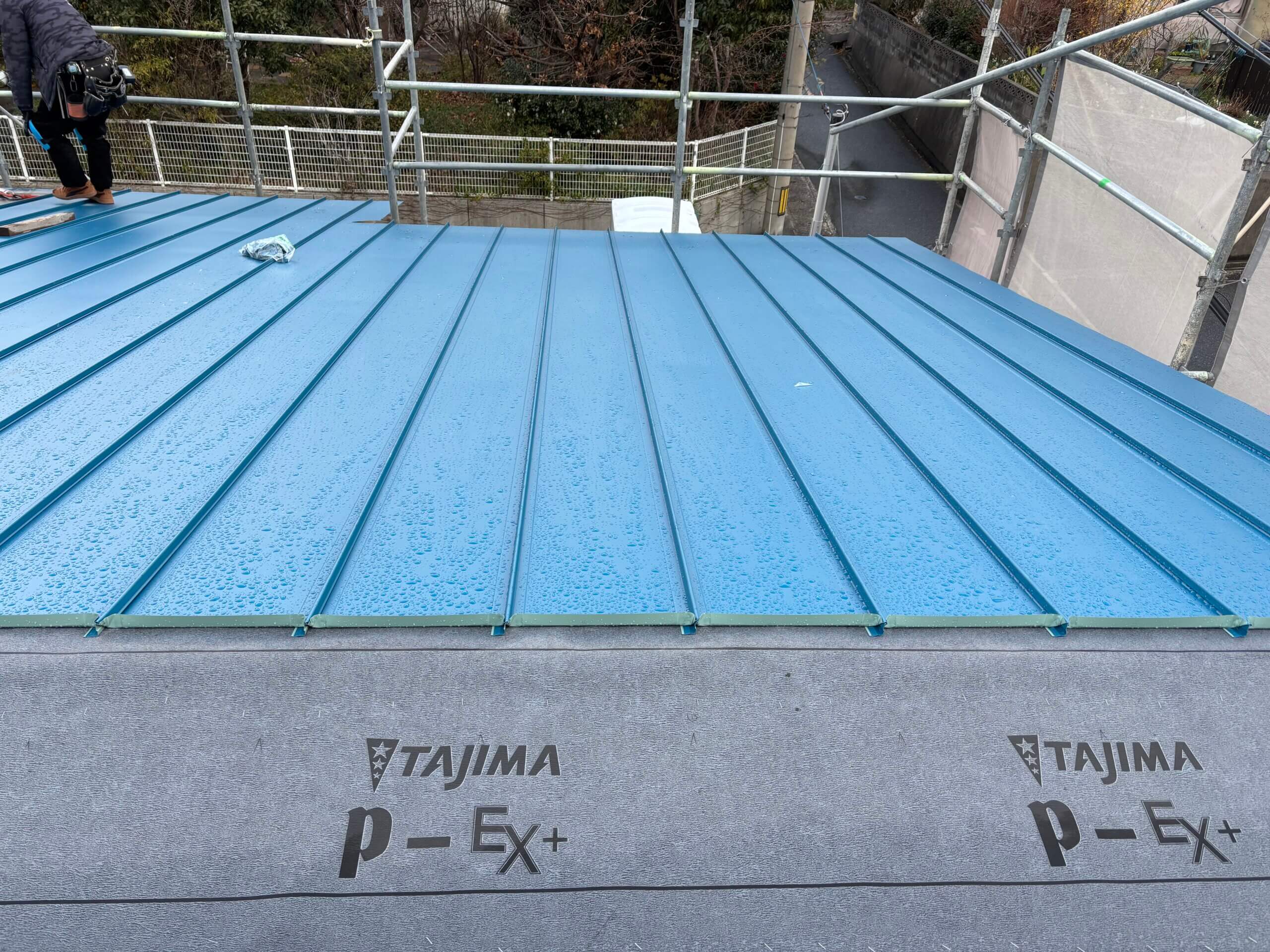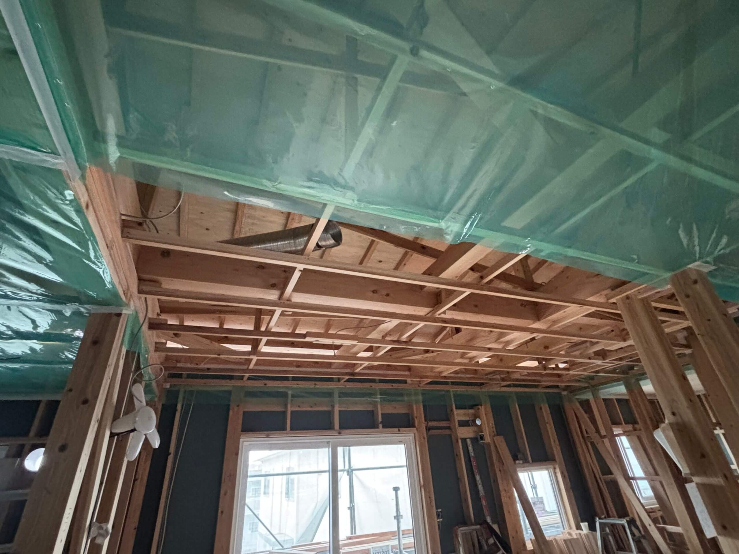 写真のは天井に気密シートを張っているところです。シートを張ったら外の空気が家の中に入りにくくなるので、冷暖房が良く効いて年中快適に過ごせますよー