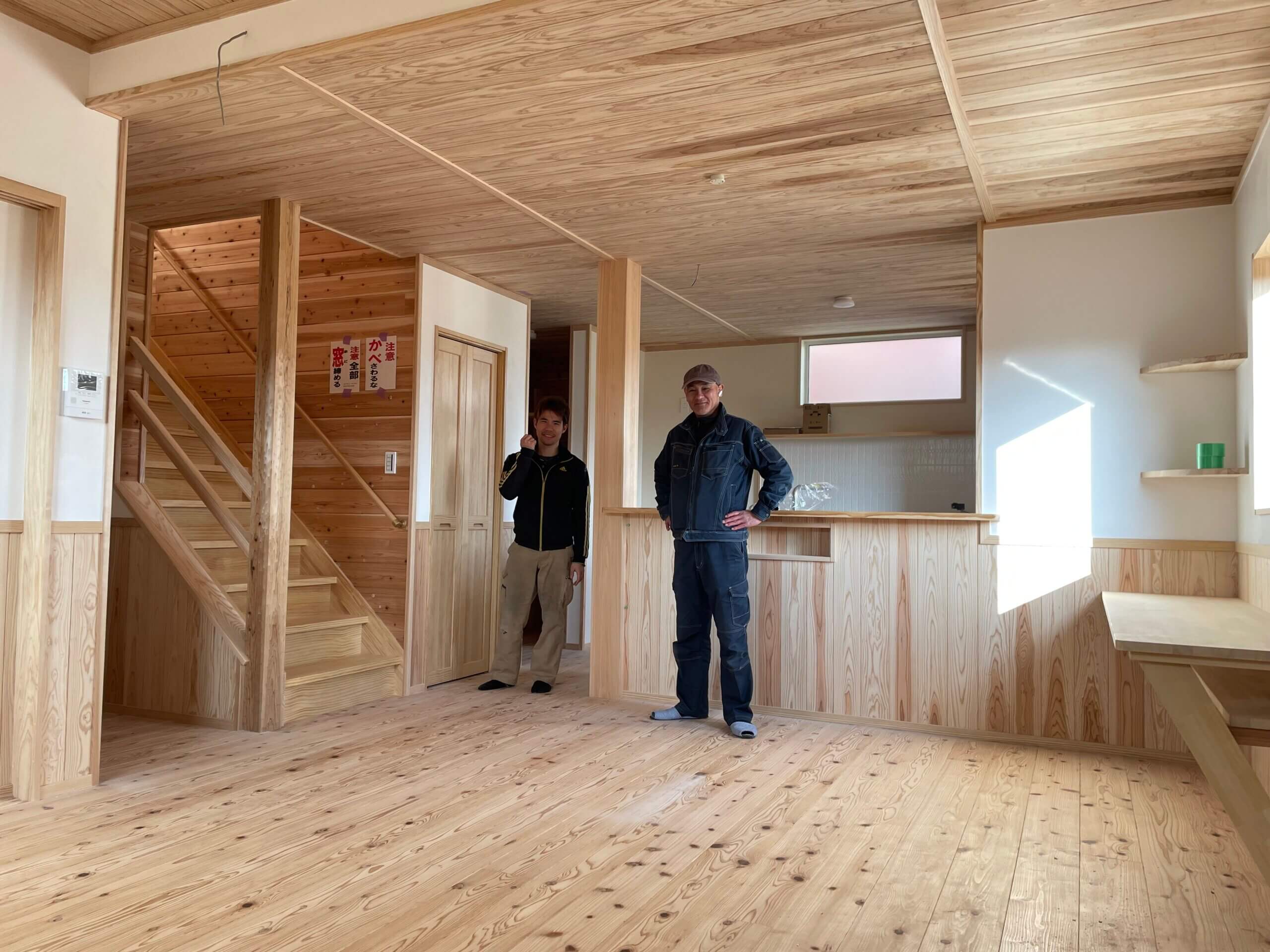 仕上げ工事に行きました 現場監督のシバタ常務とショウマ大工で記念写真でした