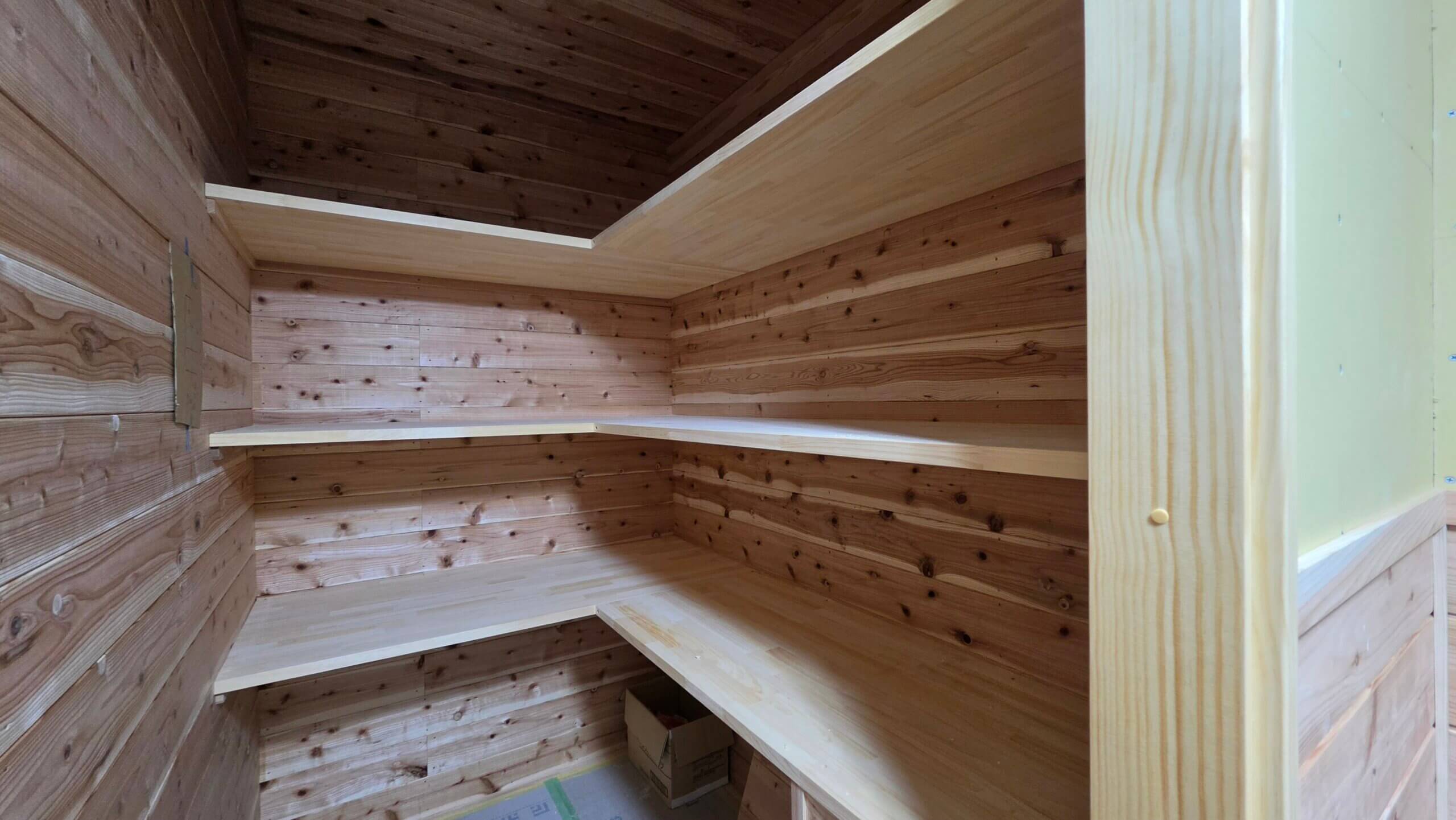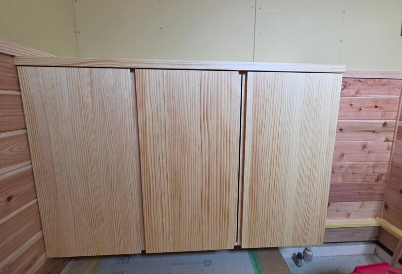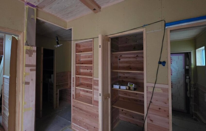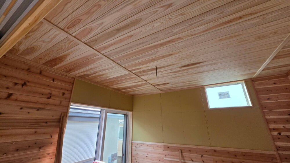 壁張りも終わり、漆喰と板の境目や板の継手の部分などに