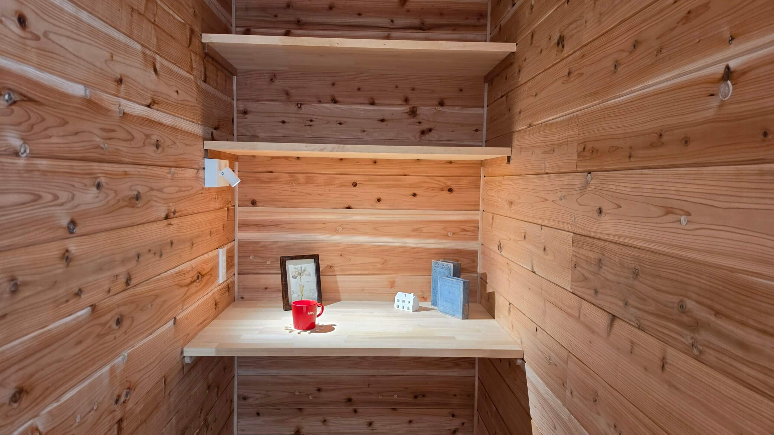 外壁はブルーの塗壁に、内装は無垢材を沢山使用した