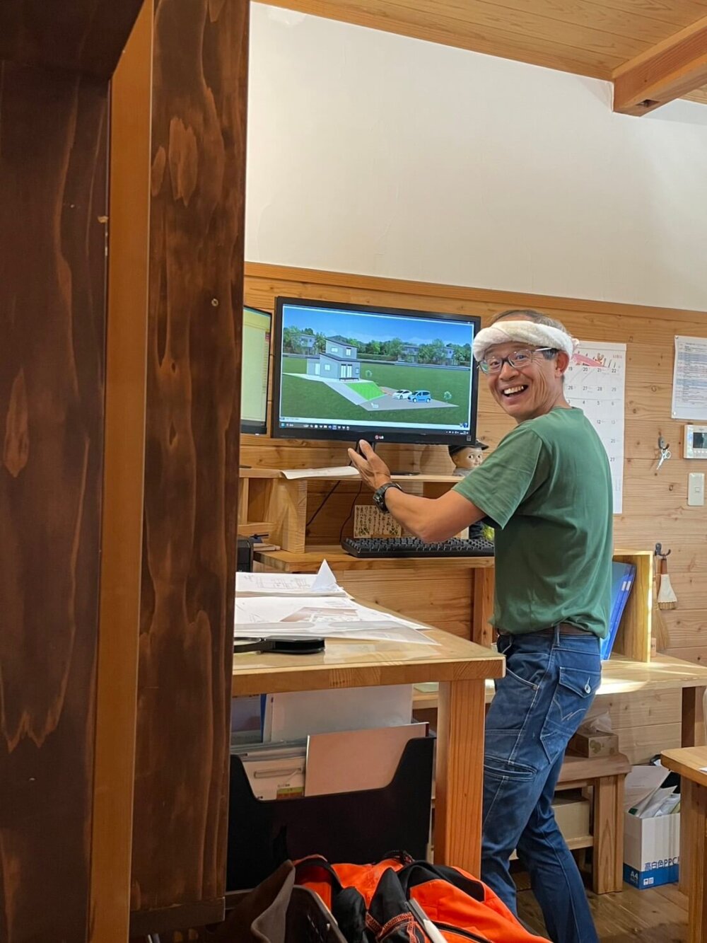 パソコンとにらめっこしながら木の家プラン一生懸命考えている鶴田部長です。