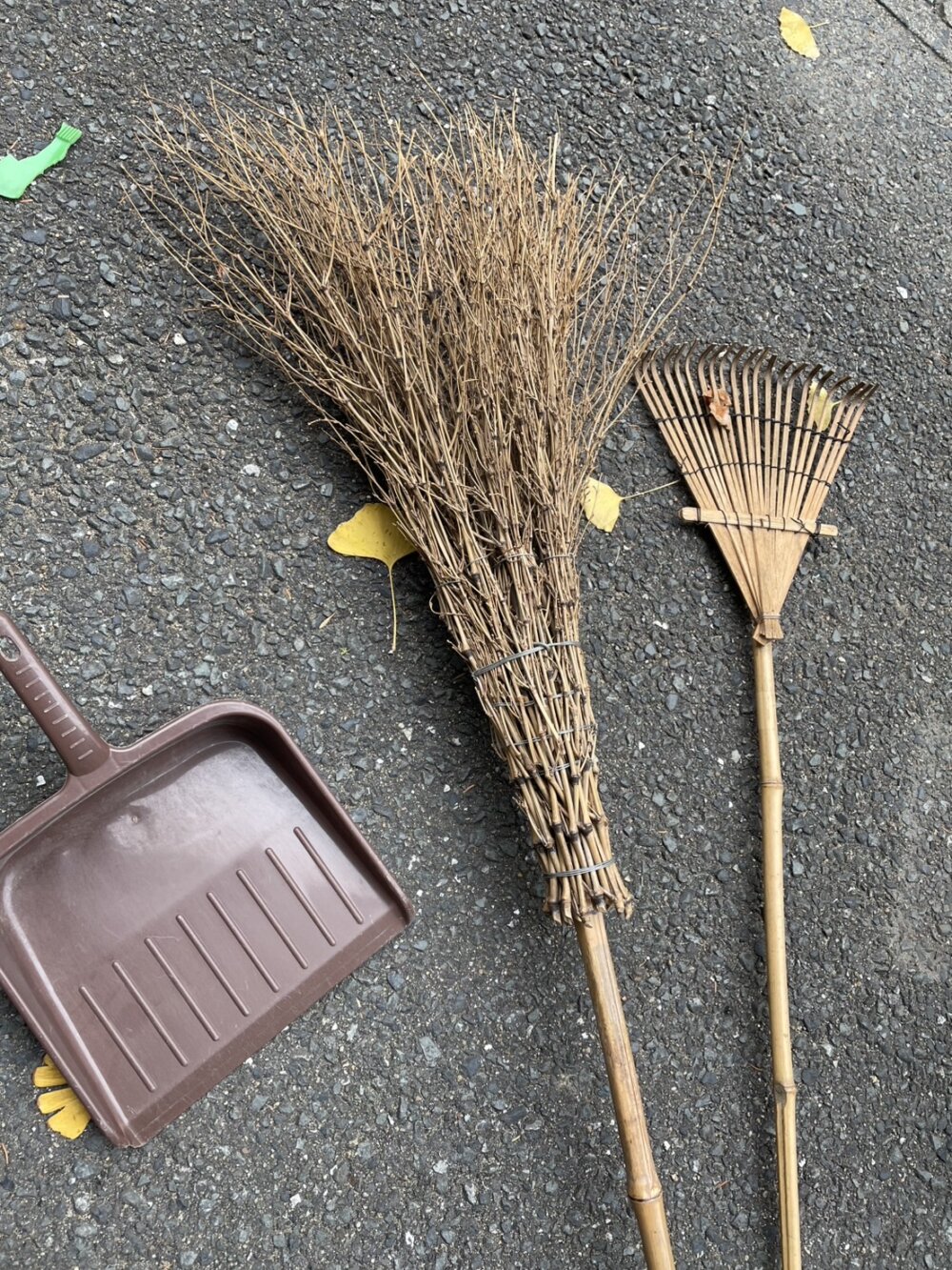 落ち葉掃除には欠かせない竹ほうき、この時期の相棒です。