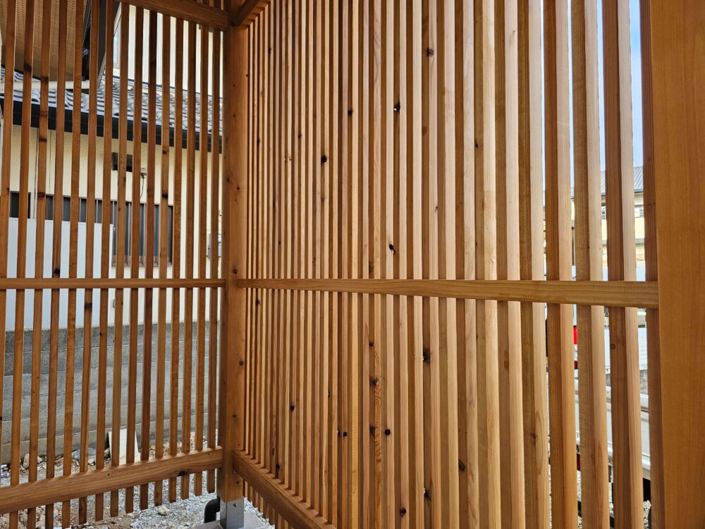 玄関には木格子を設けて、視線を遮りながらも落ち着きのある玄関先になっています。